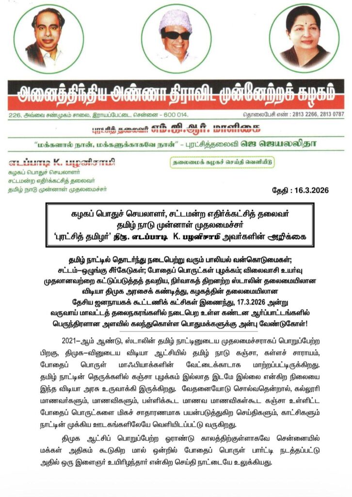 இது தொடர்பாக அதிமுக பொதுச்செயலாளர் எடப்பாடி பழனிசாமி இன்று (மார்ச் 16) ஒரு அறிக்கை வெளியிட்டுள்ளார். அந்த அறிக்கையில், “